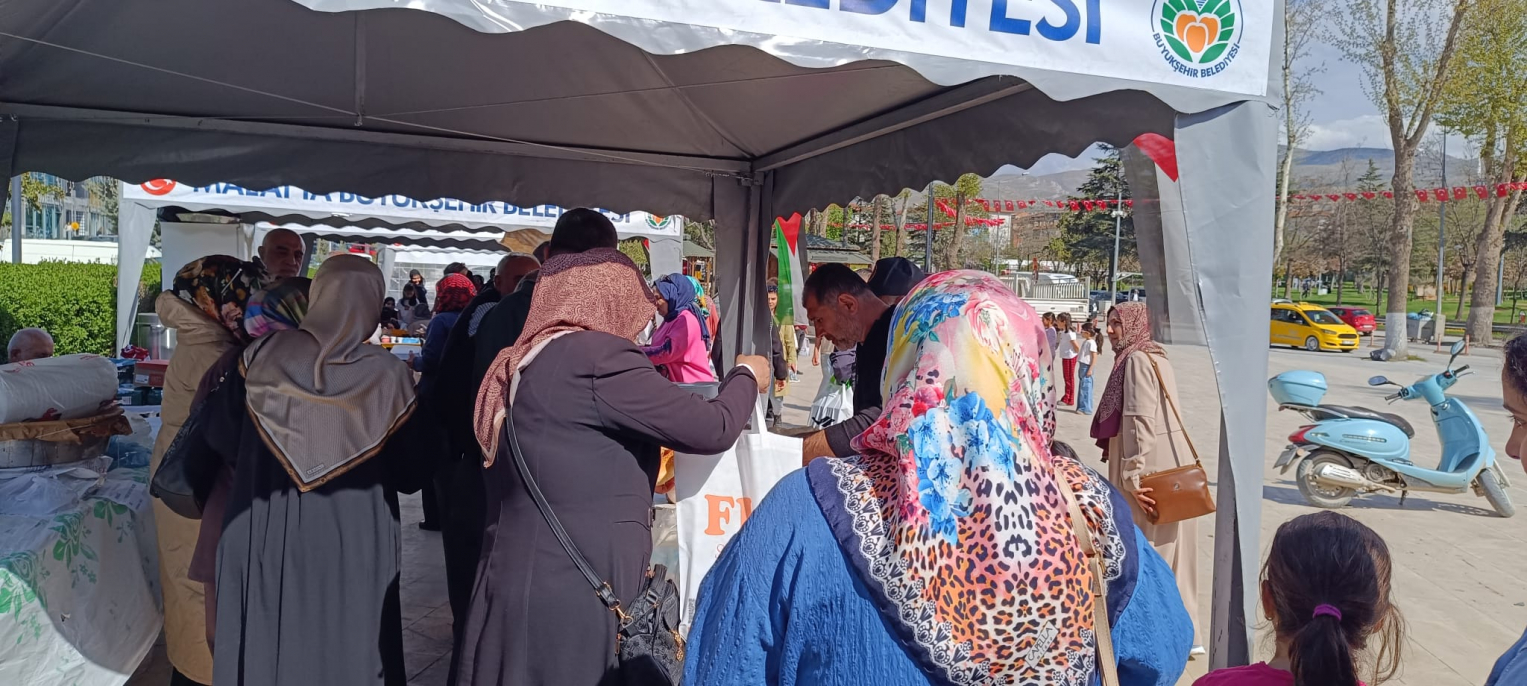 Malatya Park AVM önünde kurulan hayır çarşısında gönüllüler tarafından hazırlanan çeşitli ürünler ziyaretçilere sunulurken, elde edilen gelirlerin Kudüs ve Filistin için yürütülen insani yardım çalışmalarına katkı sağlaması hedeflendi.